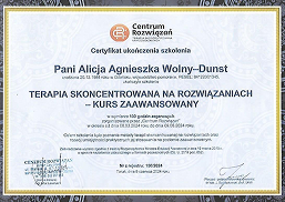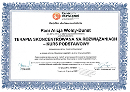Ukończyłam kurs podstawowy terapii skoncentrowanej na rozwiązaniach. Zdobyte doświadczenie i uzyskane